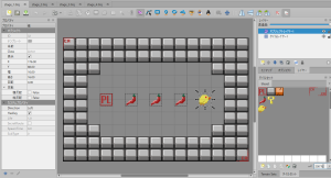 とうがらしを集め、ブロックや敵などを壊し、といった基本ルールについて考えながら、仮のマップ上をキャラが歩くところまでコーディングして、初日は終了。